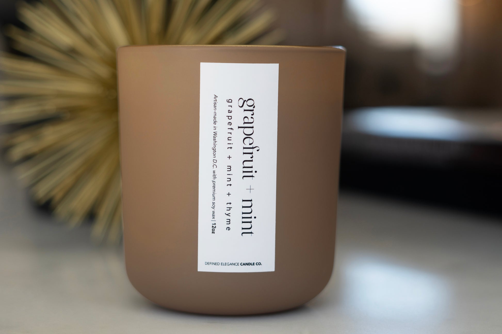 Our Grapefruit + Mint candle exudes scent notes of zesty grapefruit, invigorating mint, and herbaceous thyme, creating a crisp and refreshing aroma that revitalizes any space. Perfect for an energizing start to your day or a mid-afternoon refresh.